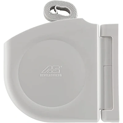 Compact screw reel in modern design Hinged box including pre-assembled roller shutter belt, grey Easy to screw on, hole spacing 80 mm Roller shutter system Mini, max. Tape length: 5 m, strip width: 14 mm Rotates 180°, can be removed from the wall bracket at any time, Manufacturer: Schellenberg