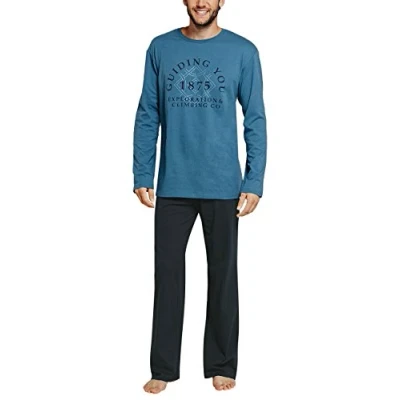 Long pyjamas for men from the Schiesser series "Northern Lights" petrol blue top with round neckline, tonal chest motif, size identification thanks to soft print in the neck area - without annoying inner label, long, dark blue trousers with comfortable two-needle waistband in pleasantly soft single jersey quality Casual, masculine and comfortable at the same time, these long men's pyjamas made from 100% soft cotton. The tonal chest motif gives the petrol blue top a harmonious detail, which is harmoniously complemented by the long, dark blue trousers. Ideal for men who prefer to enjoy restful nights in the best Schiesser quality