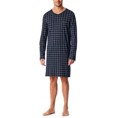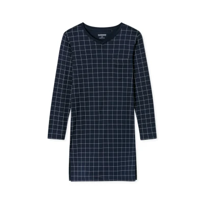dark blue long sleeve mens nightgown From the Schiesser "Fine Interlock" collection With checked pattern V-neck and chest pocket Side slits on the hem for maximum comfort and freedom of