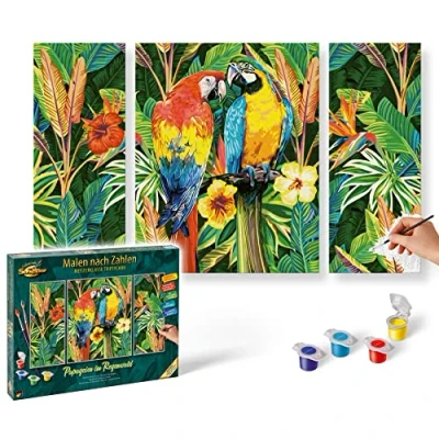 Schipper 602100535 Vogel Numbers Paragaies in The Rainforest Pictures for Adults, Includes Brush and Acrylic Paints, Triptych, 50 x 80 cm, Green, Mittel