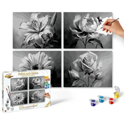Schipper 609340919 Painting by Numbers Flower Variety Pictures for Adults, Includes Brush and Acrylic Paints, Quattro 18 x 24 cm Each