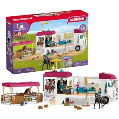 227-PIECE PLAYSET: ROAD TRIP TO THE BIG SHOW - Includes 3 horse figurines, Lisa rider action figure, her parents, a dog, Schleich horse transporter vehicle, grooming station, rooftop pool, and accessories. MAKE A SPLASH WITH INTERACTIVE FEATURES - Open the windows and go for a drive! Then take the roof off, fill the pool with real water, hose down and groom the horse mares after an exciting ride. PARTY-PERFECT SET FOR HORSE LOVERS - Celebrate birthdays or special moments with a premium horse toy set that brings big show energy, character play, and storytelling fun to young equestrians ages 5 and up. WELCOME TO HORSE CLUB - In this world of friendship and adventure, horses and characters' stories come alive. From foals frolicking on the farm, to stallions racing on the ranch, and the big horse show - it's a horse girl's paradise. IMAGINATION WITHOUT LIMITS - Schleich toys come in all shapes and sizes to bring stories to life. We value sustainability which is why we created worlds of durable toys that can be treasured for generations to come, Manufacturer: SCHLEICH
