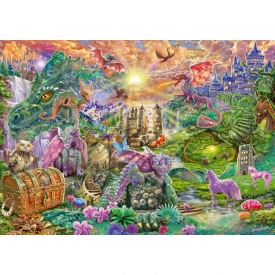 Schmidt six-star premium quality 1,000 piece jigsaw puzzle. Let your imagination carry you away, with this vividly coloured image of the Enchanted Dragon Land filled with amazing mystical creatures. Snug fitting, varied, extra thick and smooth-edged pieces. A perfect gift for any puzzler aged 12 and up The completed puzzle measures approximately 69 cm x 49 cm, Manufacturer: Schmidt