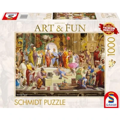 Schmidt six-star premium quality 1,000 piece jigsaw puzzle, with artwork by Markus Binz. Once completed, this puzzle shows an Art & Fun image of The School of Athens 2024. This puzzle board features snug fitting, varied, extra thick and smooth-edged pieces. A perfect gift for any puzzler aged 14 and up. The completed puzzle measures approximately 69.3 cm x 49.3 cm., Manufacturer: Schmidt Spiele