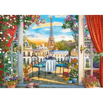 Schmidt six-star premium quality 1,000 piece jigsaw puzzle. Bonjour Paris! This 1000 piece puzzle features a beautiful terrace overlooking the sights of Paris with the Eiffel tower in the background. Snug fitting, varied, extra thick and smooth-edged pieces. A perfect gift for any puzzler aged 12 and up The completed puzzle measures approximately 69 cm x 49 cm, Manufacturer: Schmidt Spiele