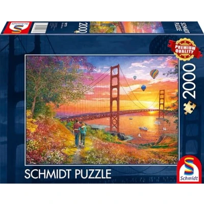 Schmidt six-star premium quality 2,000 piece jigsaw puzzle. Once completed, this puzzle shows an image of hot air balloons over the Golden Gate bridge. This puzzle board features snug fitting, varied, extra thick and smooth-edged pieces. A perfect gift for any puzzler aged 14 and up. The completed puzzle measures approximately 96.8 cm x 69.2 cm., Manufacturer: Schmidt Spiele