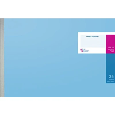 Journal / Geschäftsbuch Blattgröße 53 x 33 cm quer, Buchgröße 54 x 37 cm quer Inhalt: 48 Blatt, 80 g/m² 25 Konten (mit Raumspar-Lineatur 32 Konten) oder 51 Spalten, 40 Zeilen hochglanzlackierter Karton, hellblau, magenta einlagig drahtgeheftet