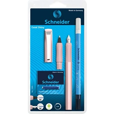 Schneider Ceod Shiny 74869 Writing Set with Fountain Pen, Rollerball Ink Killer (Right and Left Handed Users, M Nib, Includes Cartridges Royal Blue) Powder Pink