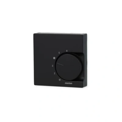 For System M thermostat cover MEG5762-0403 for bi-metal thermostat inserts in matte black. Attached with a screw The central plate is made from recycled material consisting of industrial waste The product is designed for IP20 use in flush or surface mounting. The material used reduces waste and is part of Schneider Electric's green initiative Particularly flat design. To be completed with room temperature controller insert with alternating contact 536400/01. MEG5773-0000 Room Temperature Controller Insert