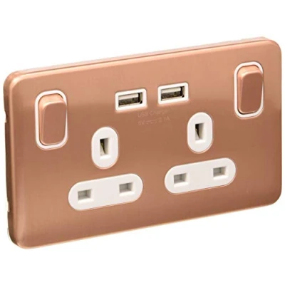 Double switched socket with 2 USB sockets rated at 5V DC 2.1A total Future proofed to cater for latest demands in technology 7mm raised edge plate with rounded profile Ideally suited for new construction and refurbishment projects requiring a smooth modern plate profile Removable screwless cover with a reliable clip-in system Gently rounded metal rocker to compliment the curved profile Light grey back moulding for easier terminal identification Cable markings to check wire length