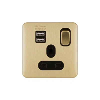 Single switched socket with 2 USB sockets rated at 5V DC 2.1A total Future proofed to cater for latest demands in technology 7 mm raised edge plate with rounded profile Ideally suited for new construction and refurbishment projects requiring a smooth modern plate profile. Removable screwless cover with a reliable clip-in system. Gently rounded metal rocker to compliment the curved profile Light grey back moulding for easier terminal identification Cable markings to check wire length Requires a 25 mm back box