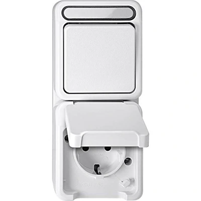 High-quality combination of Schuko socket and toggle switch for flexible use. Specially designed for the Aquastar area, which indicates high robustness and resistance to environmental influences. The polar white colour blends discreetly into the environment and gives a modern appearance. Provides versatile possibilities for indoor and outdoor electrical installation. Merten stands for proven quality and reliability in electrical installation., Manufacturer: Merten