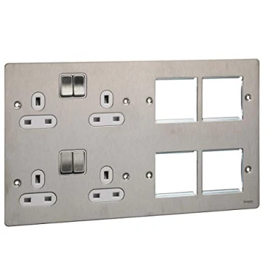 Schneider Electric Ultimate Flat Plate Switched 4 Gang Power Socket, Double Pole, with Combination Media Plate, GU32204DMPWSS, Stainles Steel White Insert