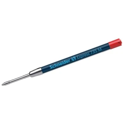 Large-capacity metal refill in ISO format G2 Refill type: red ink. Medium line width (M). Permanent in accordance with ISO 12757-2 The wear-resistant stainless steel tip guarantees that the large paste supply can be used completely and without smearing Suitable for all Schneider ballpoint pens with plug and play system and many other brands Box contents: pack of 10 Schneider Express 735 M ballpoint pen refills (ISO 12757-2 G2, indelible) red