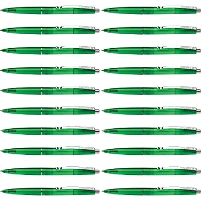 Schneider Icy Colours Retractable Ballpoint Pens in Casing and Refill Ink Colour Green, Medium Line Width Indelible in accordance with ISO 12757-2 Pack of 20 Decorative ring, push button and clip are made of metal. Ideal hold for clipboards, notebooks or blocks The wear-resistant stainless steel tip ensures that the paste supply can be used completely and without smearing The slightly curved body of the pen ensures an ergonomically comfortable writing position Thanks to the clever plug and play system, the pen can be refilled with different refill formats