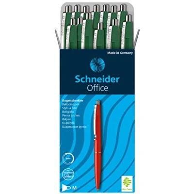 Pack of 50 Schneider pens in the case and lead writing colour green, line width medium The ink colour is analogue to the housing colour: green. Decorative ring, push button and clip are made of metal. Ideal hold for clipboards, notebooks or blocks The replaceable refill with jumbo tip medium (M) is indelible according to ISO 12757-2 Thanks to the clever Plug & Play system, the office can be refilled with different refill formats (recommended: Mine Office 765 and Express 775) The office pen ensures a comfortable writing posture and is suitable for any office: reception, warehouse or even goods acceptance