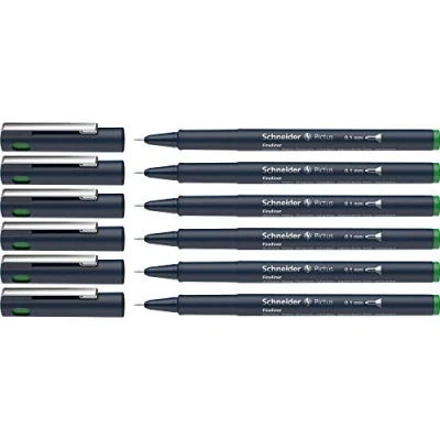 The Pictus fineliner is a professional drawing pen. Ideal for drawing, painting, sketching and writing, but also suitable for precise work with ruler or stencil The permanently brilliant colours thanks to water-based, pigmented ink emphasise the exact line guidance. The pigment liners are indelible according to ISO 14145-2 and show a high light stability Metal encased tip for long life The range of different line widths (0.05 to 0.9 mm) is useful for creative hobbies such as hand lettering, calligraphy or bullet journal The housing of the permanent markers is made from >85% recycled plastic Box contents: set of 6 Schneider Pictus fineliners, line width 0.1 mm, ink colour: green