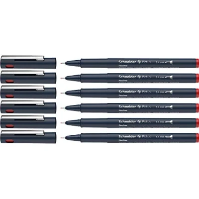 The Pictus fineliner is a professional drawing pen. Ideal for drawing, painting, sketching and writing, but also suitable for precise work with ruler or stencil The permanently brilliant colours thanks to water-based, pigmented ink emphasise the exact line guidance. The pigment liners are indelible according to ISO 14145-2 and show a high light stability Metal encased tip for long life The range of different line widths (0.05 to 0.9 mm) is useful for creative hobbies such as hand lettering, calligraphy or bullet journal The housing of the permanent markers is made from >85% recycled plastic Box contents: set of 6 Schneider Pictus fineliners, line width 0.4 mm, ink colour: red