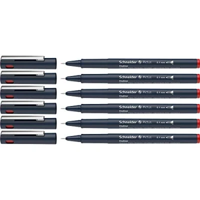 The Pictus Fineliner is a professional drawing pen. Ideal for drawing, painting, sketching and writing, but also suitable for precise work with ruler or stencil The permanently brilliant colours thanks to water-based, pigmented ink emphasise the exact line. The pens are indelible according to ISO 14145-2 and show high light stability Metal encased tip for long life The range of different line widths (0.05 to 0.9 mm) is useful for creative hobbies such as hand lettering, calligraphy or bullet journal The body of the permanent markers is made from >85% recycled plastic Box contents: set of 6 Schneider Pictus fineliners, line width 0.1 mm, ink colour: red