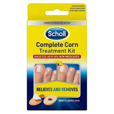 Scholl Complete Corn Removal Treatment Kit, 1 Pack Medicated Action with Salicylic Acid, Includes 6 Pads, Discs, and 9 Cushions for Effective