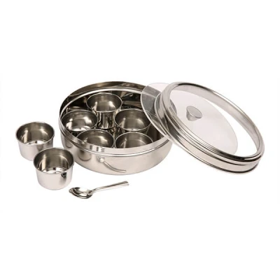 AmazonThe School of Wok Dabba means yo are never far away from your favourite spices. stainless steel handy storage tin includes 7 spice pots and a spoon to hold your favourite Asian spices The clear lid allows you to see exactly what spices are in the dabba, Weight: 1.2345886672 pounds, Manufacturer: Dexam