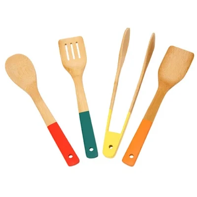 The School of Wok Set of 4 Bamboo Tools, designed with Jeremy Pang, includes a slotted spatula, spoon, spatula, and tongs made from eco-friendly bamboo with colorful silicone handles and hanging hoops. These stylish, heat-resistant utensils are ideal for wok cooking and come with a 2-year guarantee.