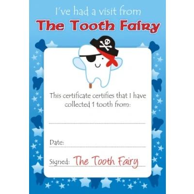 A great way of rewarding your pupil/ son for losing a tooth Beautiful A6 card certificates for your child to treasure Bright and colourful designed for boys A certificate from the Tooth Fairy Pirate himself Easy to write on