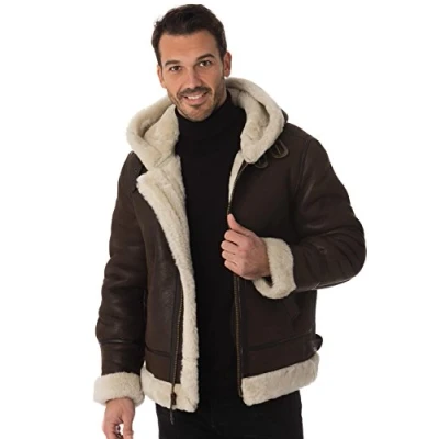 Bomber jacket, type B-3, fixed hood Leather welted seams, heavy duty hardware,buckled collar, waist adjustment straps, 2 front handwarmer pockets Standard fit Double face sheepskin
