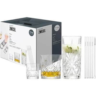 Schott Zwiesel Bar Set of 17, 4 Graceful Long Drinks, Whisky and Schnapps Glasses with Relieff, Glass Drinking Straws 1 Cotton Brush, Dishwasher Safe Crystal (Item No. 124010)