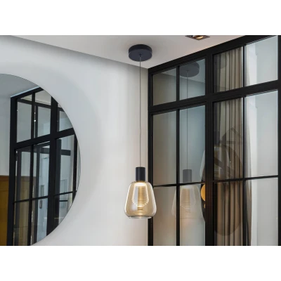 Lamp of 1 light, made of metal with a matt black finish. Double shade, exterior made of amber glass and internal diffuser in clear polycarbonate with staggered stripes. Height adjustable. 5W LED, 350lm, 3000K