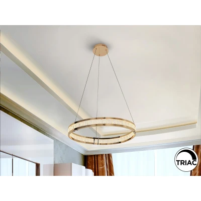 Net LightingLamp with three rings, made of steel and aluminium, shiny golden finish. Diffuser made of textured glass pieces. Adjustable height. LED lighting 26W, 2.300 lm, 3.000K. DIMMABLE, TRIAC.