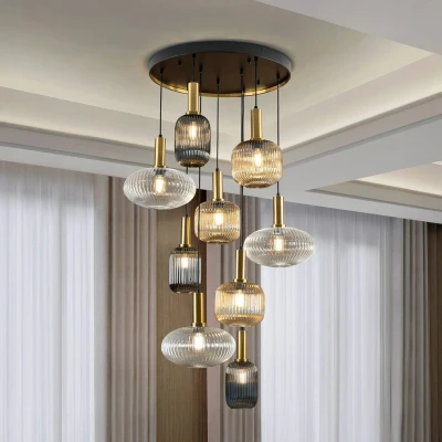Norma pendant light: elegance meets dimmable light for atmospheric rooms The 9-bulb Norma hanging light combines stylish design with functional lighting, making it a highlight in any dining or living room. Made of high-quality glass and metal, it impresses with its elegant colour combination of amber and smoky grey tinted and clear lampshades, brass-coloured metal tubes above the lampshades and a black canopy. The 9-bulb construction ensures even illumination, while the standardised E27 socket allows for easy replacement of the LED light source. The light comes with dimmable LED bulbs. With a colour temperature of warm white (2,700 K), the lamp creates a cosy atmosphere. A special feature of the Norma hanging light is that it can be dimmed using the remote control supplied. This allows for flexible adjustment of the light intensity to create the desired mood. The energy-saving LED technology contributes to efficiency, while the sustainable packaging reduces the ecological footprint. This lamp is not only a functional lighting element, but also a stylish accessory that gives every room a special touch.