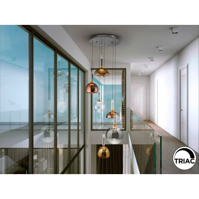 Charlize LED pendant light with 6 glass shades and dimmable LED driver Charlize is an LED pendant light with 6 lampshades made of electrolytically coated glass in various shapes and in the colours gold, copper and transparent, which hang from a round canopy made of brushed aluminium in a dark grey tone. The lampshades contain LEDs with a warm white light colour. The light is equipped with a LED driver with TRIAC and 0-10 V dimming, so that the brightness can be dimmed with an LED wall dimmer with these functions. It comes with GRAVITY toggles to improve the ceiling fixture.