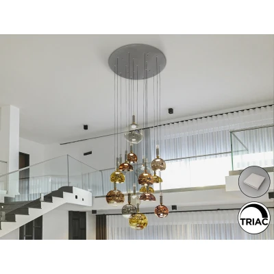Charlize LED pendant light with 16 glass shades, dimmable Charlize is an impressive LED light with 16 light sources. Its canopy is made of brushed aluminium in a dark grey colour. The 16 glass shades of different sizes and shapes, made of electrolytically coated glass in copper, gold, silver and transparent, are equipped with LEDs that provide warm white light. The dimmable LED driver allows the light to be dimmed via an external triac or 0-10 V dimmer. The light includes a dimmer set with a dimmer and radio frequency remote control, or can be dimmed with a TRIAC or 0-10 V wall dimmer. The Charlize LED pendant light not only illuminates a wide area, but also becomes an eye-catcher in any large room or gallery.