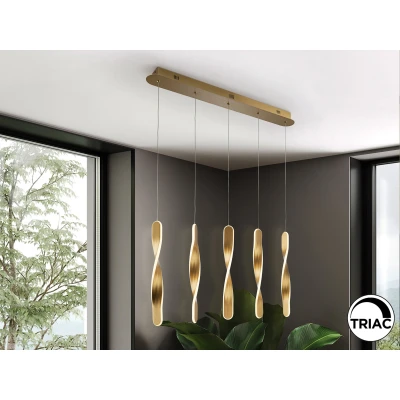 5-bulb LED pendant light Twist with twisted aluminium elements, gold-coloured The long, 5-bulb LED pendant light Twist catches the eye with the special shape of the lampshades. It is completely gold-coloured and consists of five twisted aluminium elements that hang from the long canopy. These are covered all round with an opal white silicone cover. Behind these covers are the warm white LEDs, which emit a very uniform light without visible points of light thanks to the opal white material and illuminate the edges of the individual lighting elements.