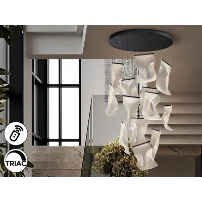Velos II LED pendant light in an extraordinary design The Velos II LED pendant light is eye-catching thanks to its special design and provides effective, warm white lighting. The light's 13 lampshades are made of micro-printed methacrylate and look like delicate strips of fabric or film moving in the wind. The canopy and lampshade holders are made of metal with a matt black finish. The light is a design element that will stylishly complement any living room or dining room. The built-in LEDs emit a warm white light that creates a pleasant atmosphere. The possible suspension system of up to 300 cm also makes the light perfect for use in open galleries or stairwells. The light is equipped with a dimmable LED driver (via triac or 0-10V), so that it can be dimmed using an external dimmer. A dimmer set is also included.