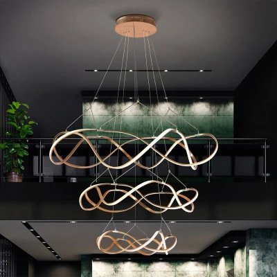 Molly LED pendant light in an impressive size, dimmable by triac Molly is a 3-tier LED light made of aluminium with a rose gold finish and chrome details. The intertwined light elements made of narrow metal strips with single-sided opal silicone diffusers, behind which the warm white LED strips are located, hang from the round canopy on three levels. This product includes LED drivers with TRIAC and 0-10V dimming. It includes a dimming set with receiver and radio frequency remote control. The light can also be used with a TRIAC or 0-10V wall dimmer. This light comes with GRAVITY toggles to improve the ceiling attachment.