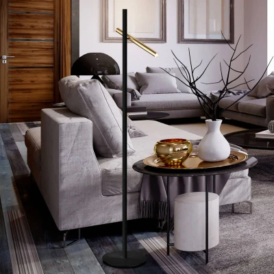 Timelessly elegant Varas floor lamp in black and gold - 2-bulb With its contrasting colours - matt black and shiny gold - the Varas floor lamp is a real eye-catcher even when unlit and adds a timelessly elegant touch to any room. An LED is built into the upper end of the frame rod, so that the light shines indirectly towards the ceiling, while the tubular shade element is fitted with a second LED light source at the lower end, which emits its light directly into the surroundings. Both light sources emit a soft warm white light, creating a cosy atmosphere.