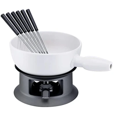 High quality ceramic pot Incl. heat-conducting disk 6 forms included Fondue pan also suitable for use on cookers Safety paste burner