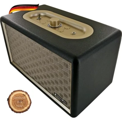Retro Bluetooth speaker - inspiring sound in a casual vintage look of a guitar amplifier for your home Wireless music enjoyment from smartphone with Bluetooth V4.2 up to 10 m range or for analogue listening pleasure with cable via AUX-IN Elegant vintage design made of faux leather, with high-quality control strip in metal look for a classic HiFi design Rechargeable lithium-ion battery for a runtime of up to 2.5 hours, with simple and reliable Bleutooth connection Box contents: Bluetooth speaker, 3.5 mm jack cable, power cable, instruction manual (English language not guaranteed)