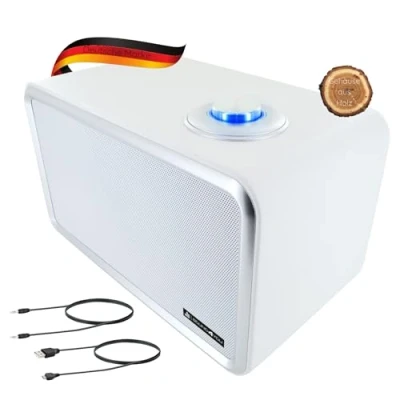 SCHWAIGER 661736 Modern Retro Bluetooth Speaker Vintage Leather Look Wooden Housing Battery Wireless HiFi Music Box with Jack Cable Micro USB White