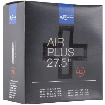 Holds air even longer thanks to higher wall thickness. Less frequent re-inflation is necessary. Also provides above-average protection against puncturesKey Features:ETRTO: 40/62-584Weight: 305 gValve: SVValve length: 40 mmBead: ButylExecution Tube: Air PlusItem: 21APSizes:40-584 - 27.5 x 1.50 - 650B47-584 - 27.5 x 1.75 - 650B50-584 - 27.5 x 2.00 - 650B54-584 - 27.5 x 2.10 - 650B57-584 - 27.5 x 2.25 - 650B60-584 - 27.5 x 2.35 - 650B62-584 - 27.5 x 2.40 - 650B