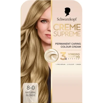 Schwarzkopf Creme Supreme 8 0 Natural Blonde, Permanent Hair Dye, Caring Dye Colouration with 3 Step Bonding System Against Damage, 100% Grey Coverage