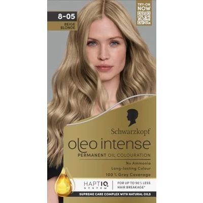 Schwarzkopf Oleo Intense Permanent Oil Colour 8 05 Beige Blonde Hair Dye, Perfect Grey Coverage, Conditioner with HaptIQ System, Long Lasting Colour, Ammonia Free Dye