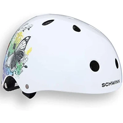 Skate, scoot & ride in SAFETY with the Schwinn Butterfly helmet for use with BMX, skateboards, stunt scooters or roller skates Fitting size between 54-58cm means this helmet is suitable for both youth's aged 8+ and adult's alike TOUGH outer shell absorbs impacts to help reduce the risk of head injuries SECURE chin fastener with ADJUSTABILTY for maximum SAFETY 11 BREATHABLE air vents for high air flow and VENTILATION