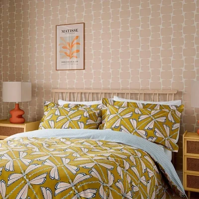 WallpaperDirectFeaturing geometric patterns and subtle dragonflies on a mustard background. Made from 100% cotton, its soft, breathable fabric ensures a comfortable night's sleep. Included in the set is two matching Oxford pillowcases.