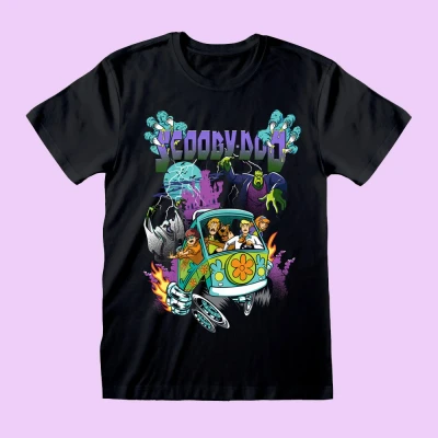 AmazonOfficial Scooby-Doo T-Shirt – Black – Full-Colour Mystery Machine & Gang Graphic – Warner Bros Licensed Adults Unisex Cartoon Tee (UK, Alpha, XL, Regular, Regular)