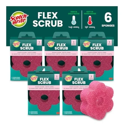STAYS CLEAN & LASTS LONG: This Scotch-Brite Flex Scrub 1-pack is a non-scratch kitchen sponge that rinses clean to help resist odors for a fresh clean every time EASY TO SQUEEZE: The squeezable shape of the cleaning scrub sponge fits comfortably in your hand and makes daily dish duty feel effortless FLEXIBLE & DURABLE PERFORMANCE: This dish sponge features a temperature-controlled material that stays firm in cold water and soft in warm water for long-lasting cleaning performance DISHWASHER SAFE: Toss the kitchen sponge in the top rack of your dishwasher to clean and sanitize the sponge up to 20X CLEANS TIGHT SPOTS WITH EASE: The flexible petals reach into tight spaces, and the center hole is ideal for cleaning utensils like spoons, knives, and chopsticks, making this sponge the perfect cleaning essential STANDS UPRIGHT: This kitchen sponge stands upright between uses to dry quickly and store cleanly NON-SCRATCH PERFORMANCE: It’s safe to use the scrub sponge on nonstick cookware, muffin tins, ceramic bakeware, countertops, bathtubs, indoor and outdoor furniture, and more