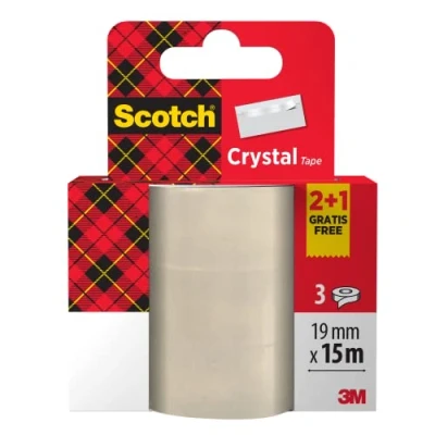 Scotch Crystal Clear Tape, Promo Pack of 2 Rolls + 1 FREE, 19 mm x 15 m Provides a Strong and Permanent Bond