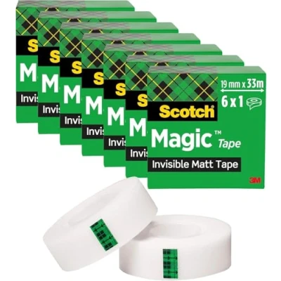 TRUSTED 3M ADHESIVE TECHNOLOGY: The Scotch Brand's matte-finish invisible tape uses trusted 3M adhesive technology to bond tightly with paper ORIGINAL MATTE FINISH, INVISIBLE TAPE: Scotch Magic Tape is frosty on the roll, but disappears when applied on most paper Great value multi-pack 100'S OF USES: Perfect for permanent paper mending, repairing documents, wrapping gifts, sealing envelopes, mending photos, labelling containers, and more PERFECT FOR LABELLING: Can be written on by pen, pencil or marker